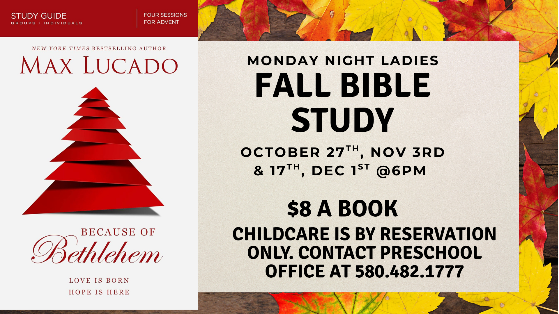 ** Must contact Preschool Office to make arrangements for childcare. Contact Joyce or Sharla 580-482-1777.