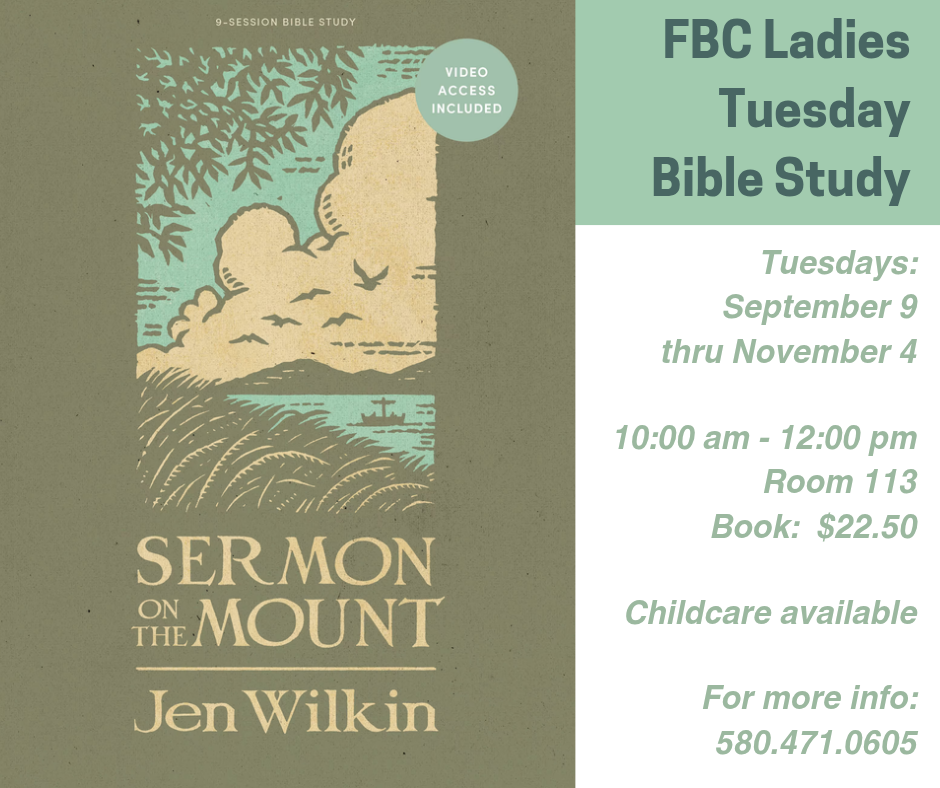 Monday Night Bible Studies are a great way to fellowship with one another and learn more about God's Word. We meet in room 113 at 6pm. For more information, please contact Nancy Cofer at 580.480.2129. We would love to have you join us.