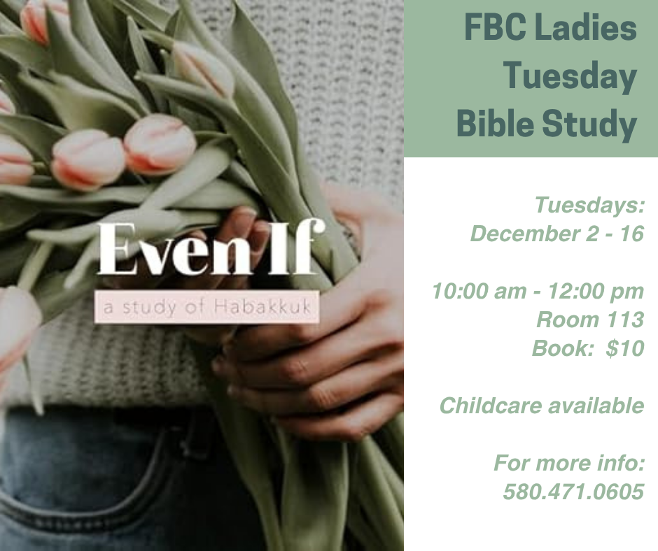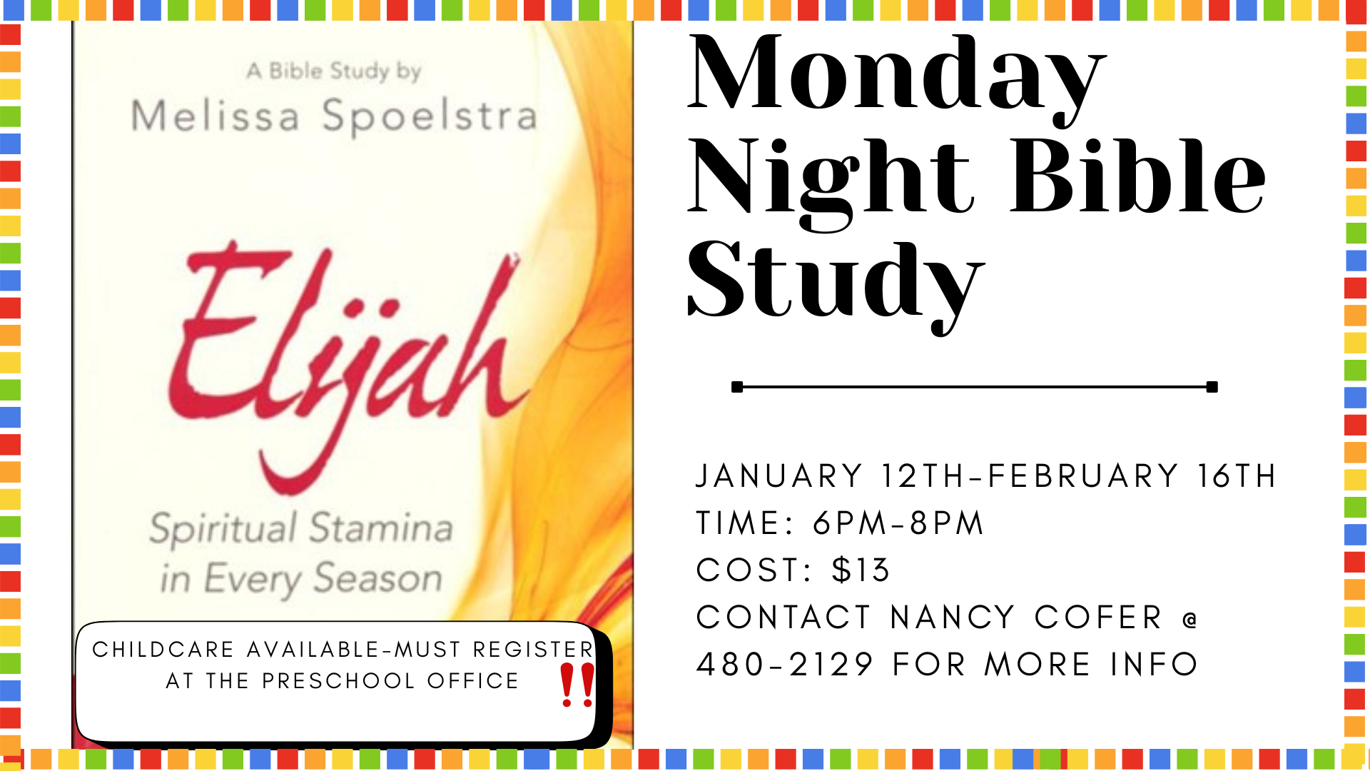 Monday Night Bible Studies are a great way to fellowship with one another and learn more about God's Word. We meet in room 113 at 6pm. For more information, please contact Nancy Cofer at 580.480.2129. We would love to have you join us.